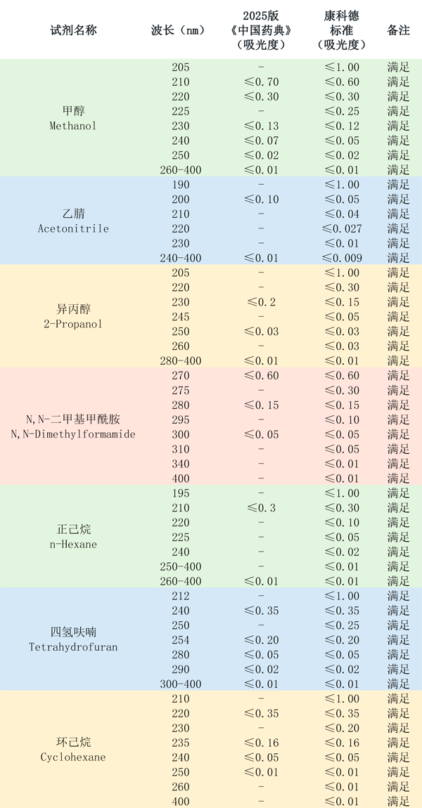 2025年10月1日,《中華人民共和國藥典》(2025年版)正式實施。新版藥典對色譜級試劑的紫外吸收性能提出了更系統、更嚴格的要求,新增多項關鍵波長的檢測指標。