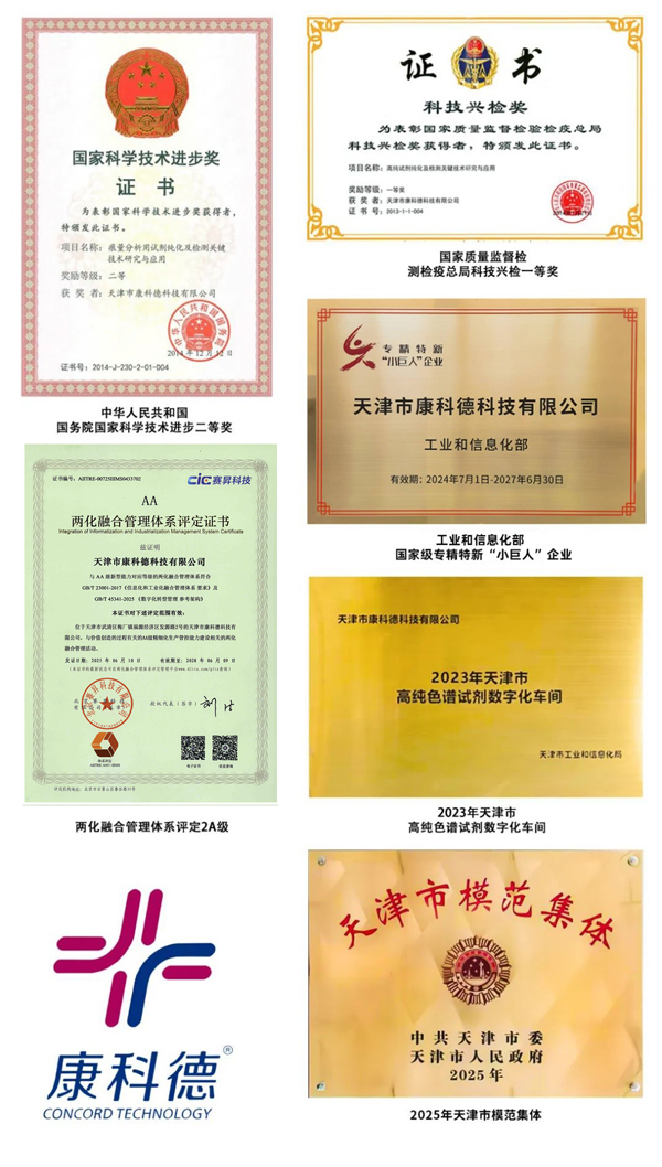 康科德公司先后承擔國家級和市級以上科研項目10余項,牽頭制定并起草國家化工行業標準3項;采用國際最高標準,制定企業標準50多項;申請專利126項。先后榮獲國家科學技術進步二等獎、國家質監總局科技興檢一等獎,“高純色譜試劑數字化車間”列為市級智能制造示范項目,2024年被天津市評為先進級智能工廠,2025年獲評天津市模范集體。天津市“專精特新”產品2個,天津市重點新產品1個。