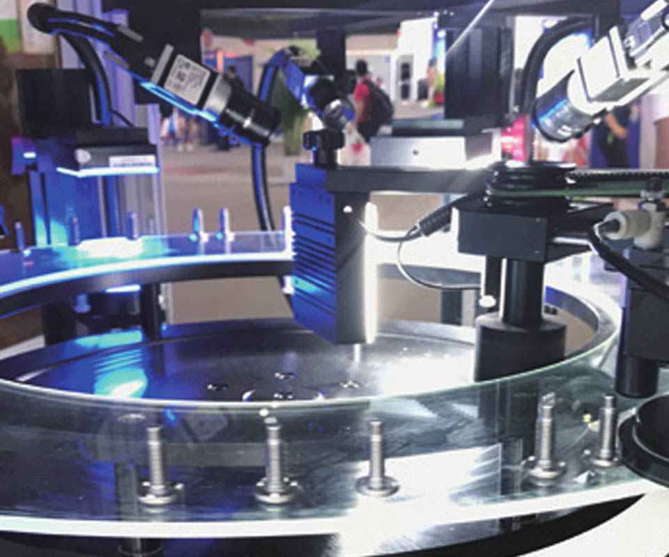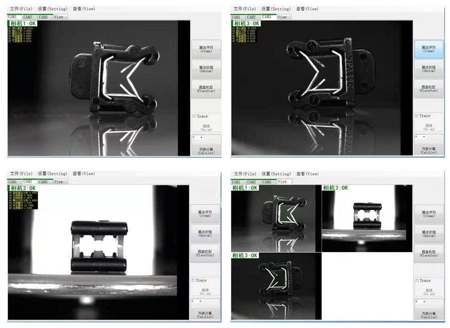 3、 視覺檢測系統(tǒng):由4套相機及相應光源組成:1#底部相機檢測產(chǎn)品底部投影面尺寸及毛刺;2#側面相機檢測產(chǎn)品側面投影面尺寸及毛刺,3#底部表面相機檢測產(chǎn)品底面倒角尺寸和表面的大裂紋,4#頂部表面相機檢測產(chǎn)品頂面倒角尺寸和表面的大裂紋。